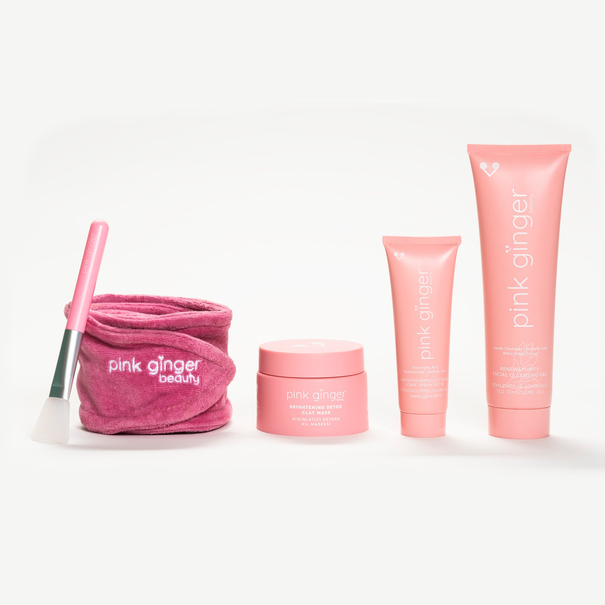 Pink Ginger Purify & Glow Essentials provides healthy, rejuvenated, detoxified, and brightened appearance. Self-Care Kit is powered by natural clay, hyaluronic acid, witch hazel extract, pomegranate extract, salicylic acid, niacinamide and ginger essential oil.